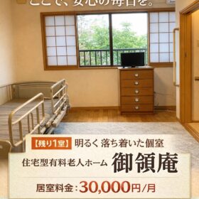 住宅型有料老人ホーム御領庵では、現在個室1室の空きがございます。 大きな窓からやさしい光が差し込み、季節の移ろいを感じながら穏やかにお過ごしいただける…