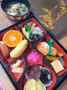 職員が心を込めて用意したおせち料理を召し上がりながら「わあ!すごい!」「美味しいね」と自然と笑顔になられていました。