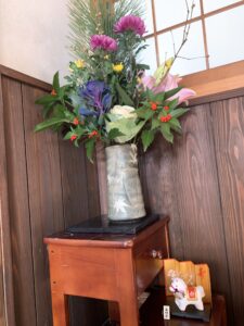 施設内では職員がキレイに生けた花と、干支の置物が館内を明るく彩り、利用者様居室の表札にはそれぞれにミニしめ縄も飾りました。